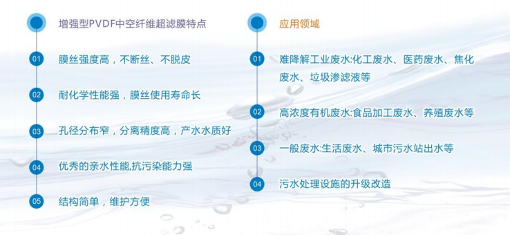 采用PVDF材质制成,具有更强的机械强度,膜丝拉伸强度超过200N;采用双皮层结构,能够有效的去除水在绝大部分的杂质,去除效果明显;抗氧化与抗污染性能非常优异,能够应用于污水处理中,且亲水性能好,使用寿命长;能够在温度较高的环境中使用,且强磺、强碱对中空纤维膜的影响较小,耐受氧化剂能力强,过滤精度非常高,通常中空纤维膜的孔径小于0.1微米,能够有效过滤水中的杂质;采用压力作为过滤原理,设备设计简单、工作流程简易、操作方便、容易控制以及维护,使用寿命长,正常设计和运行维护,膜寿命不低于三年。